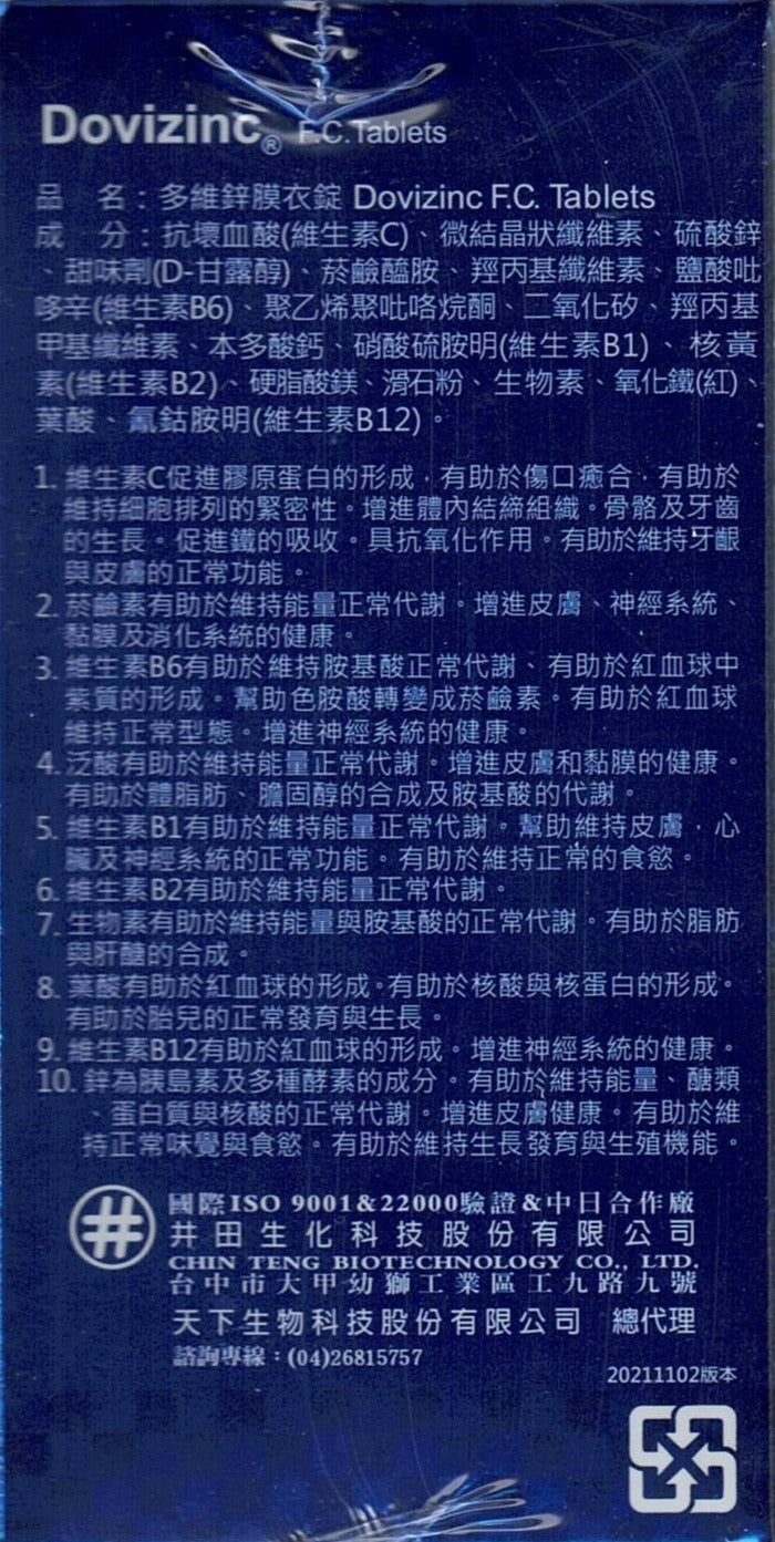 Ascorbic acid (vitamin C), microcrystalline cellulose, zinc sulfate, sweetener (D-mannitol), nicotinic acid amide, hydroxypropyl cellulose, pyridoxine hydrochloride (vitamin B6), polyvinylpolypyrrolidone, Silicon dioxide, hydroxypropyl methylcellulose, calcium benzoate, thiamine nitrate (vitamin B1), riboflavin (vitamin B2), magnesium stearate, talc, biotin, iron oxide (red) , folic acid, hydrocobalamin (vitamin B12)